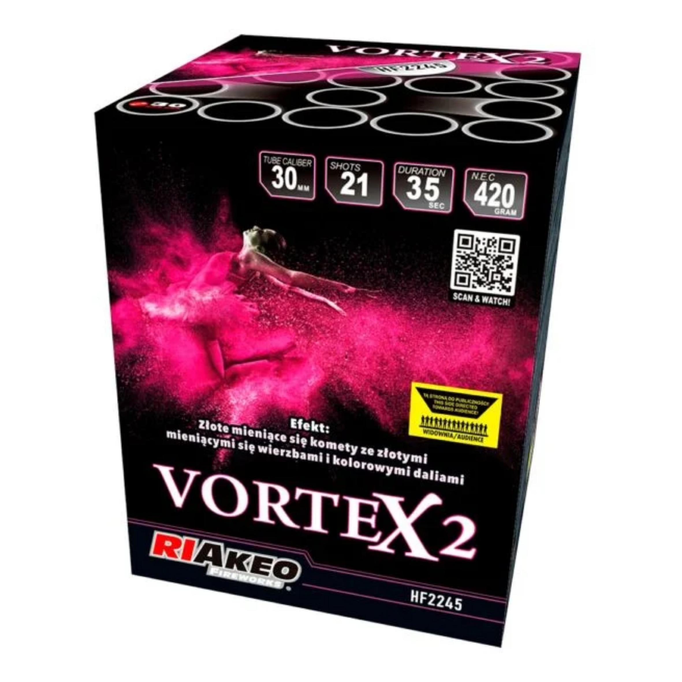Solidna konstrukcja oraz wysokiej jakości komponenty gwarantują stabilność, niezawodność działania oraz powtarzalność efektów. RIAKEO VORTEX 2 HF2245 doskonale sprawdzi się podczas Sylwestra, dużych imprez plenerowych, wesel, festynów oraz wszystkich wydarzeń, gdzie liczy się profesjonalny wygląd pokazu, moc i widowiskowy charakter.